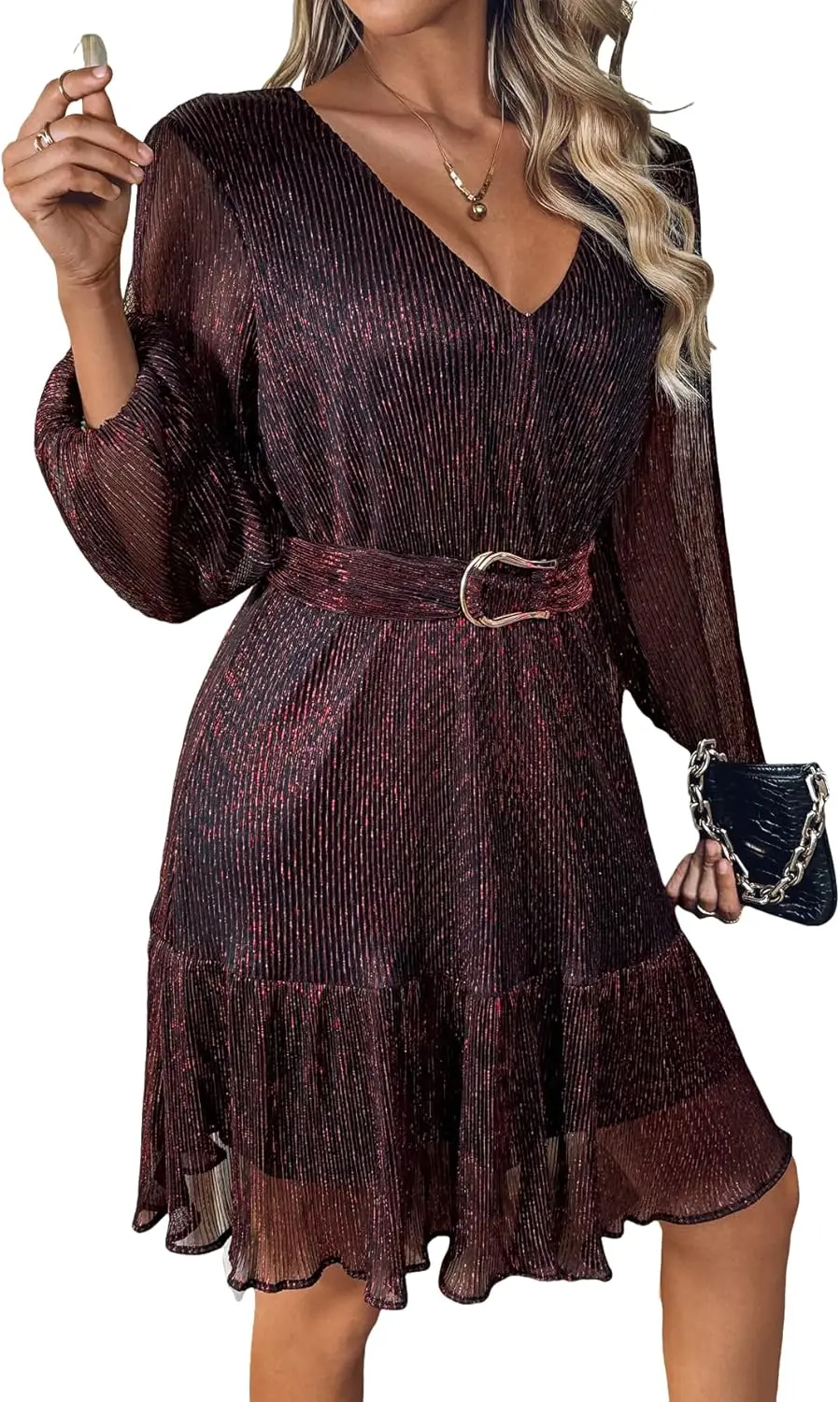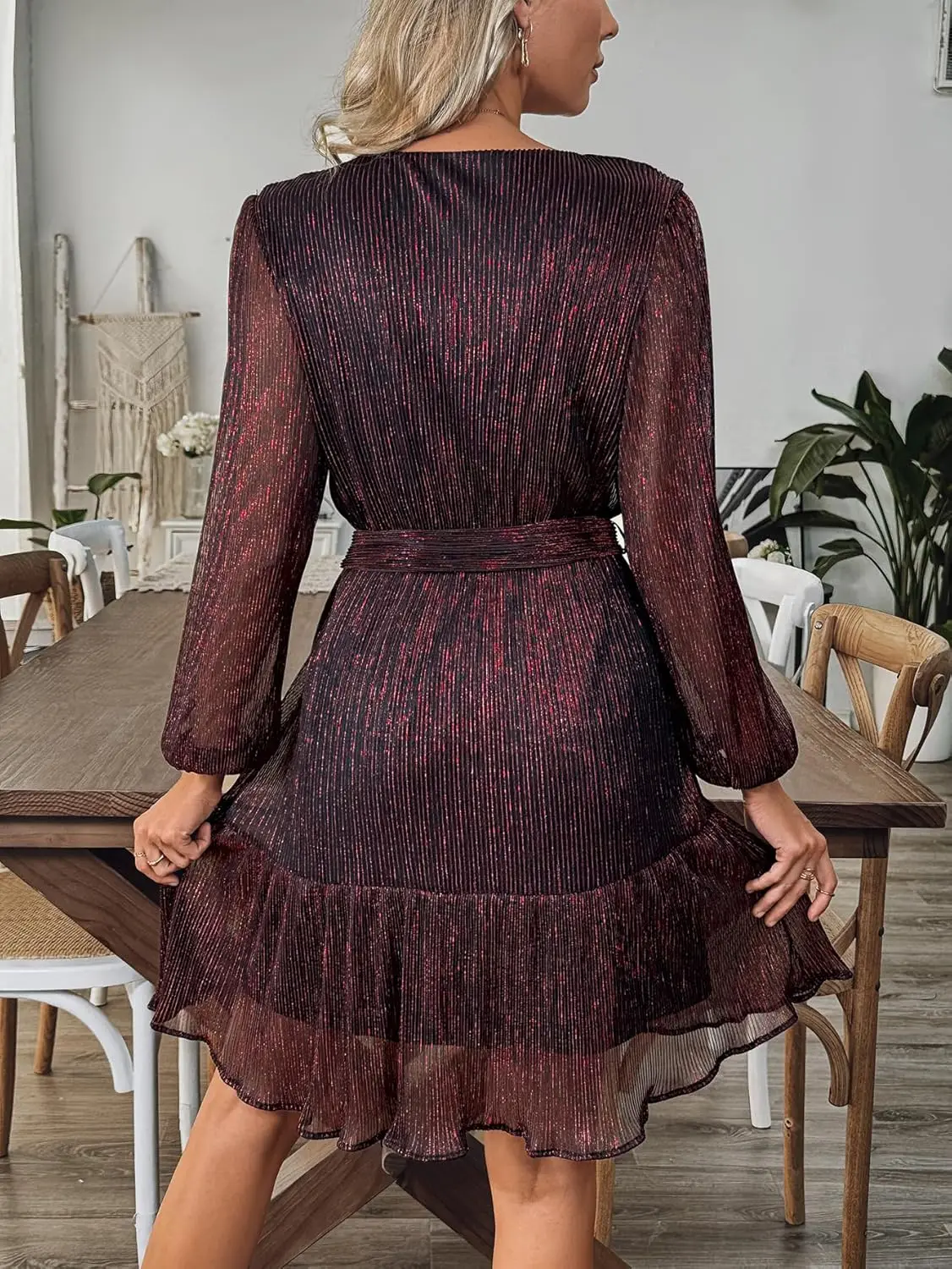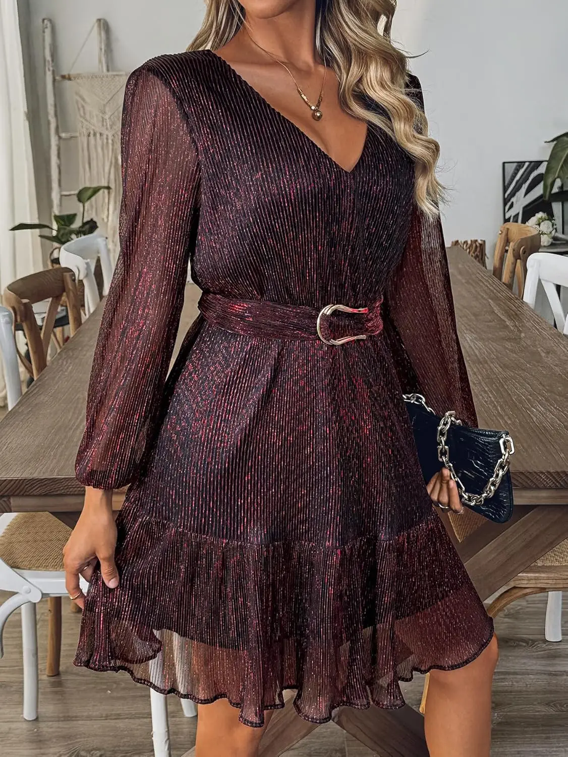 Women's Chiffon Party Summer Dress Long Sleeve Lined Belt V Neck Tea-Length A-Line Silhouette Candy Color Anti-Static Natural